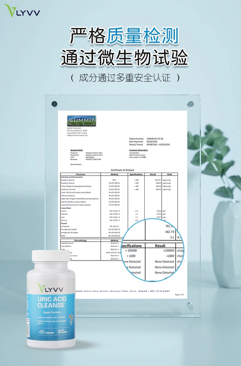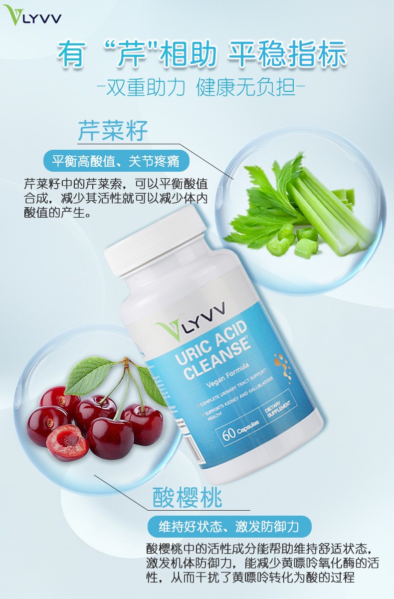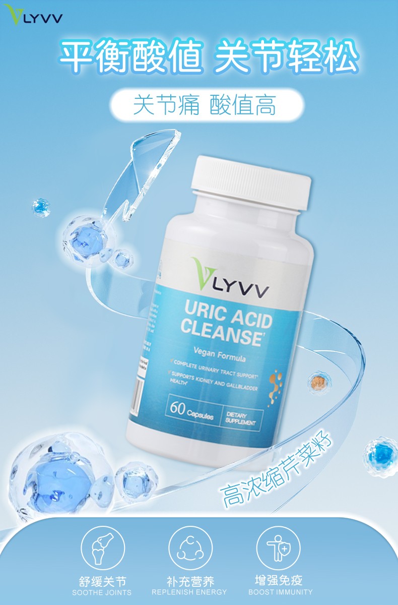 • 全面的关节和尿酸支持:VLYVV Uric Acid Cleanse 有助于维持关节健康,支持正常的尿酸水平,并帮助代谢体内多余的尿酸。