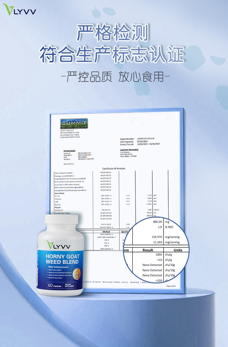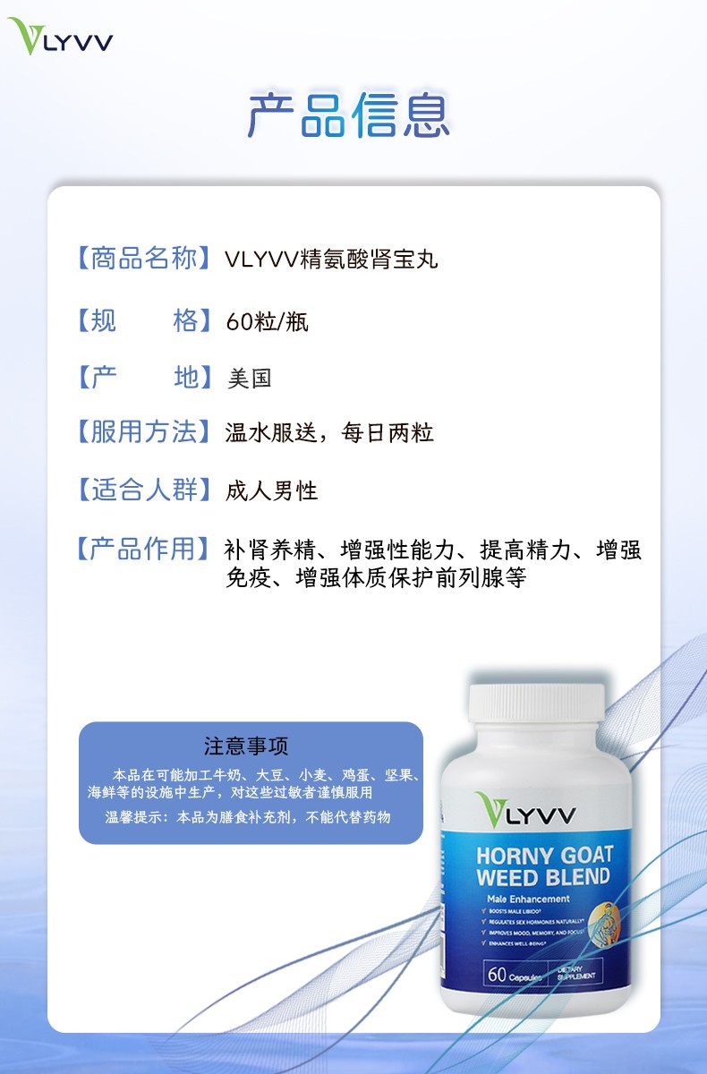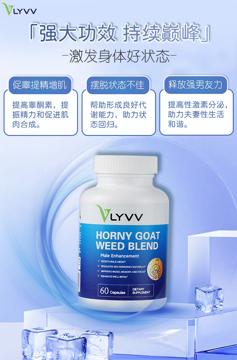 全面提升性功能支持:VLYVV淫羊藿配方提供增强性功能、提升能量、促进整体健康的完整解决方案。 • 提升性欲:强效结合淫羊藿、玛卡和东革阿里,显著增强性欲。 • 改善勃起功能:L-精氨酸促进血液循环,支持更强硬且持久的勃起。 • 提升耐力和能量:玛卡和人参根共同作用,改善整体能量水平和耐力。 • 改善情绪和动力:魔布豆有助于维持健康的多巴胺水平,增强情绪和动力。 • 前列腺健康支持:锯棕榈浆果有助于前列腺健康,减少泌尿道症状。 • 使用方法:每日服用两粒胶囊,以支持整体男性健康和活力。